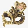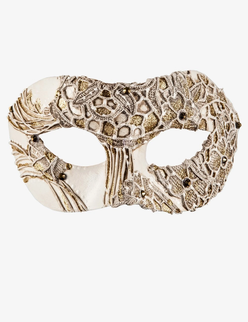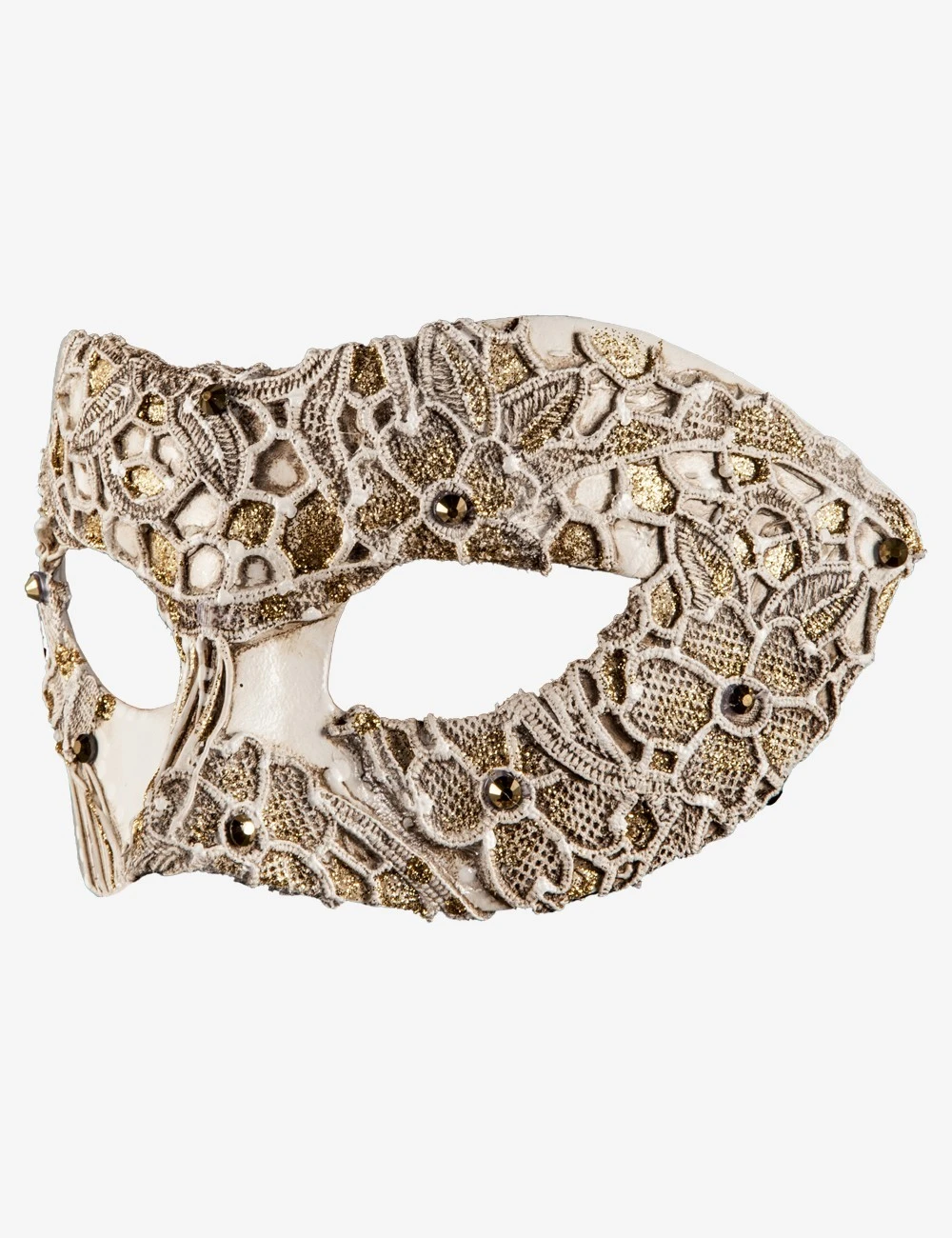 Ambra venetian mask in papier mache with macramé lace decorations made in Italy. Handcrafted according to the original Venice carnival tradition.