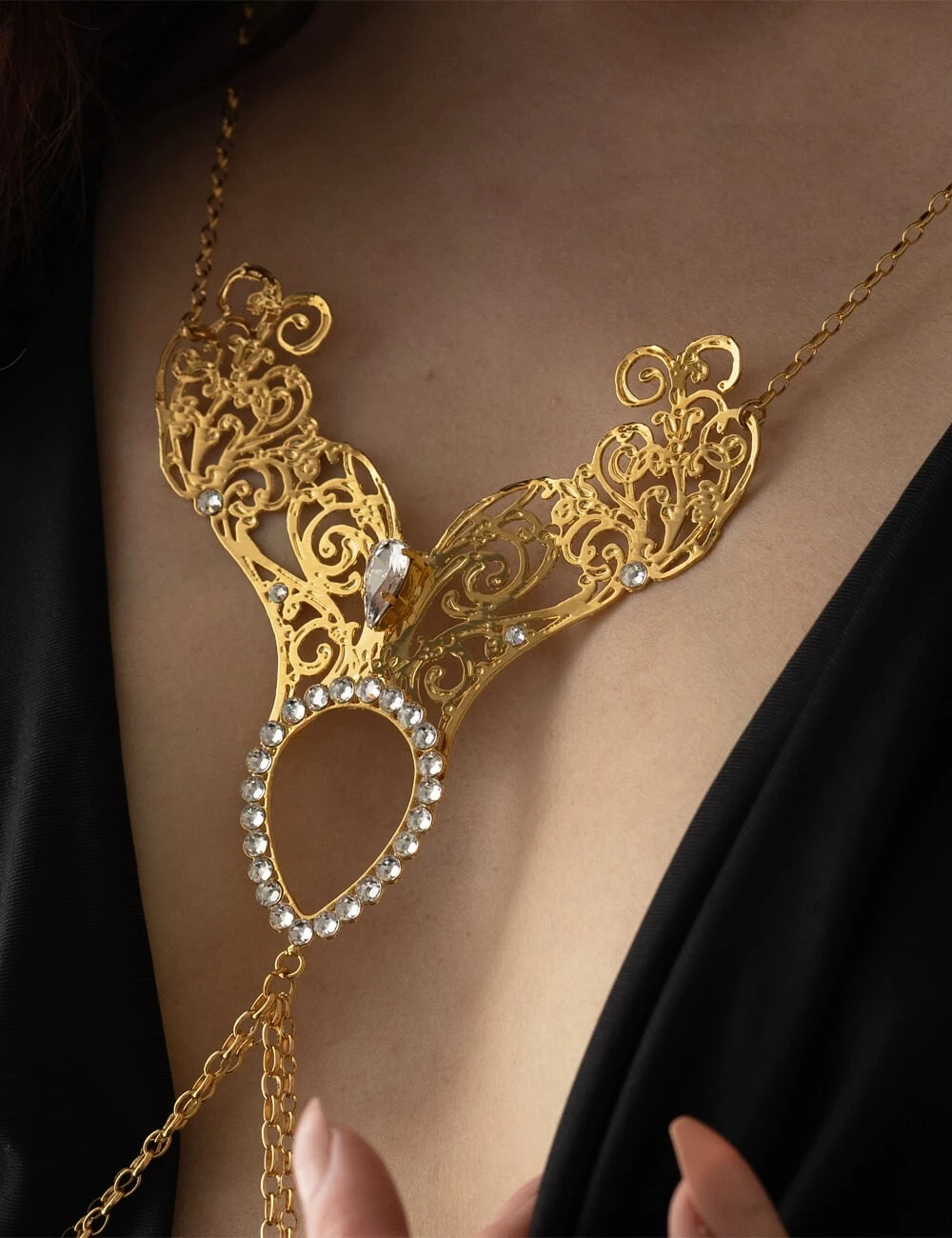 Bramosa: Jewel with metal filigree body chains in bath gold embellished with high quality certified crystals. These products do not contain nickel. Handmade in our Venetian workshops.