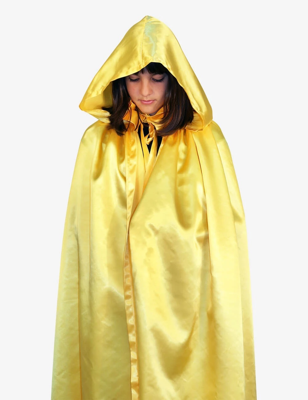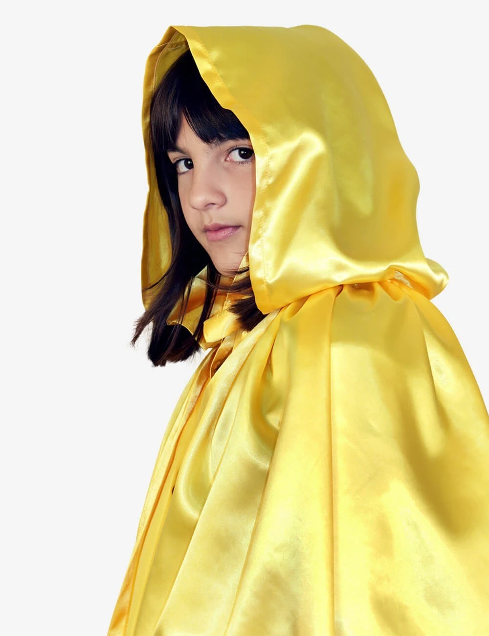 Yellow Varese satin bridesmaid cape with hood and ribbon closure.