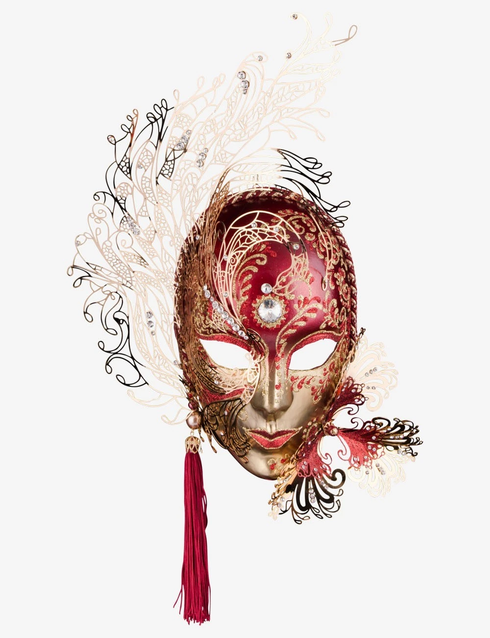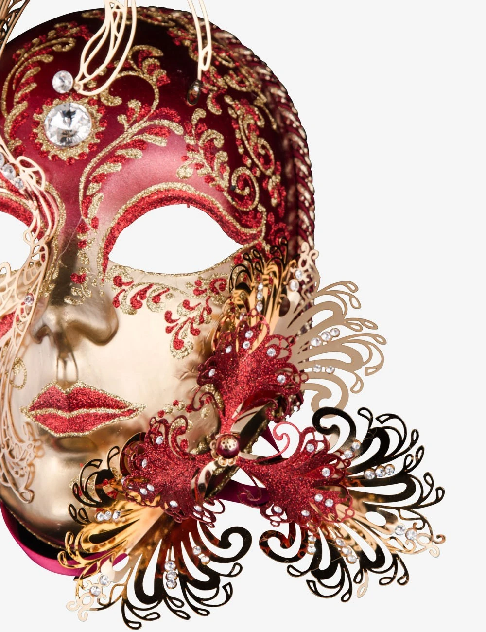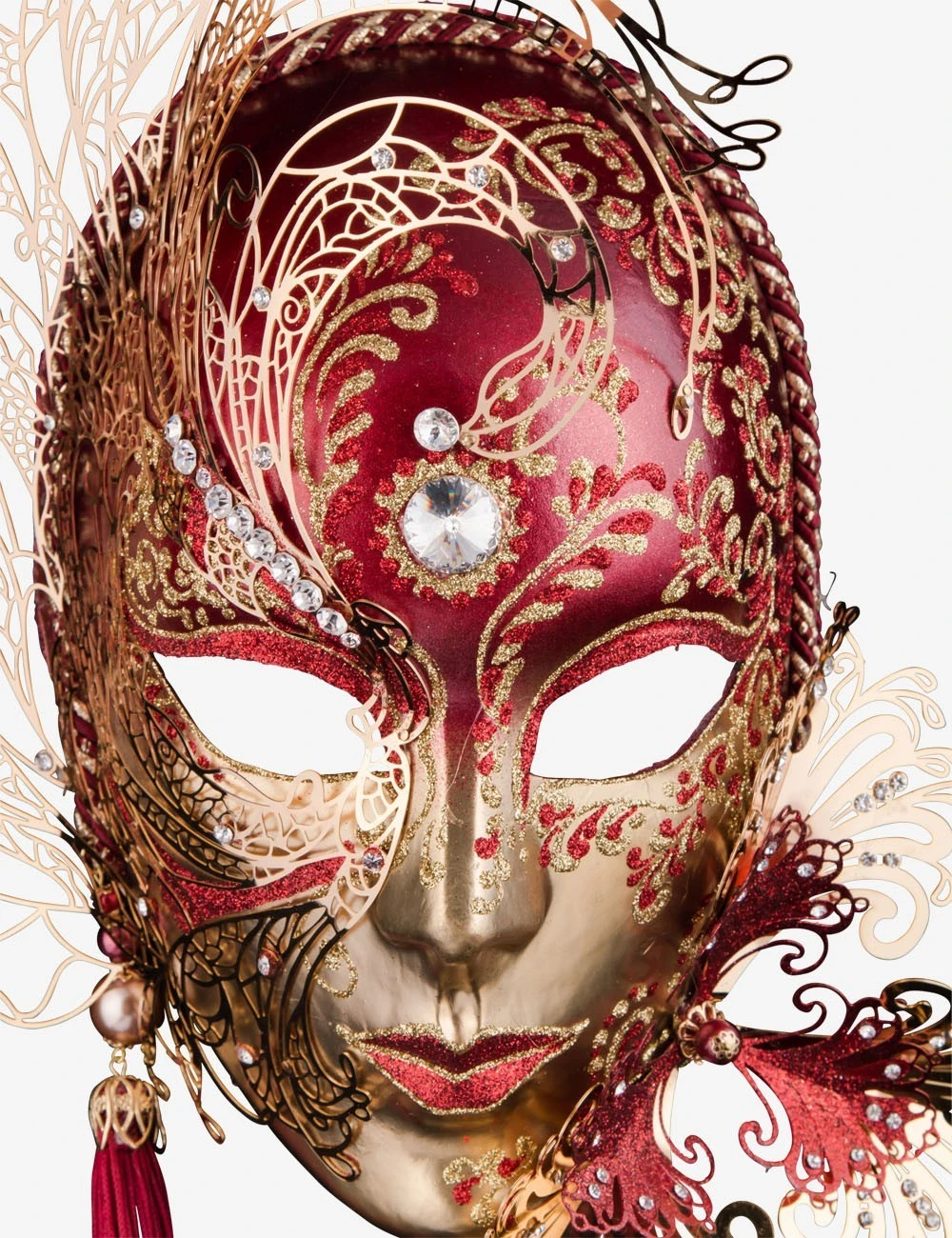 Cygnus Red authentic venetian mask in papier mache with metal decoration. Handcrafted according to the original Venice carnival tradition. Manufactured in Venice by the famous venetian masters. Each item is provided with certificate of authenticity.