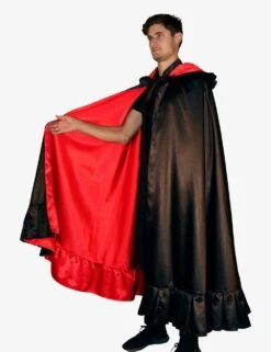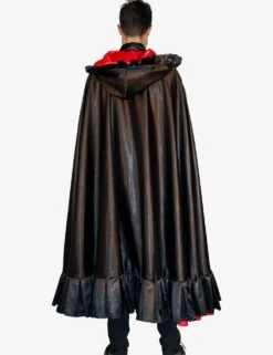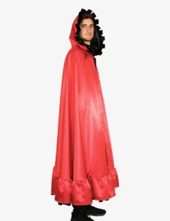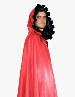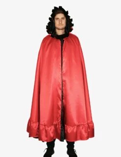 Red/black double face cloak in Varese satin with hood embellished with soft pleats and flounce at the bottom.