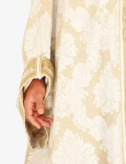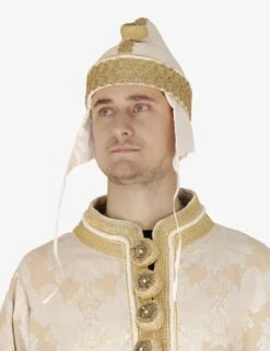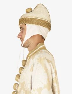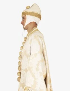 ‘Monsignor el Doxe’ dress consisting of cape with sleeves, white damask fabric with gold trimmings Handmade padded buttons Complete with Doge’s horn and white bonnet (Camauro) Length on request.