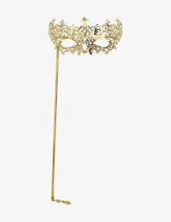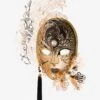 Gold Borgia with Strass and Stick authentic venetian mask made of metal. Handcrafted according to the original Venice carnival tradition. Manufactured in Venice by the famous venetian masters. Each item is provided with certificate of authenticity.