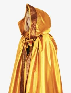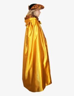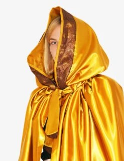 Gold yellow Varese satin cape with hood and borders embellished with brown lace.
