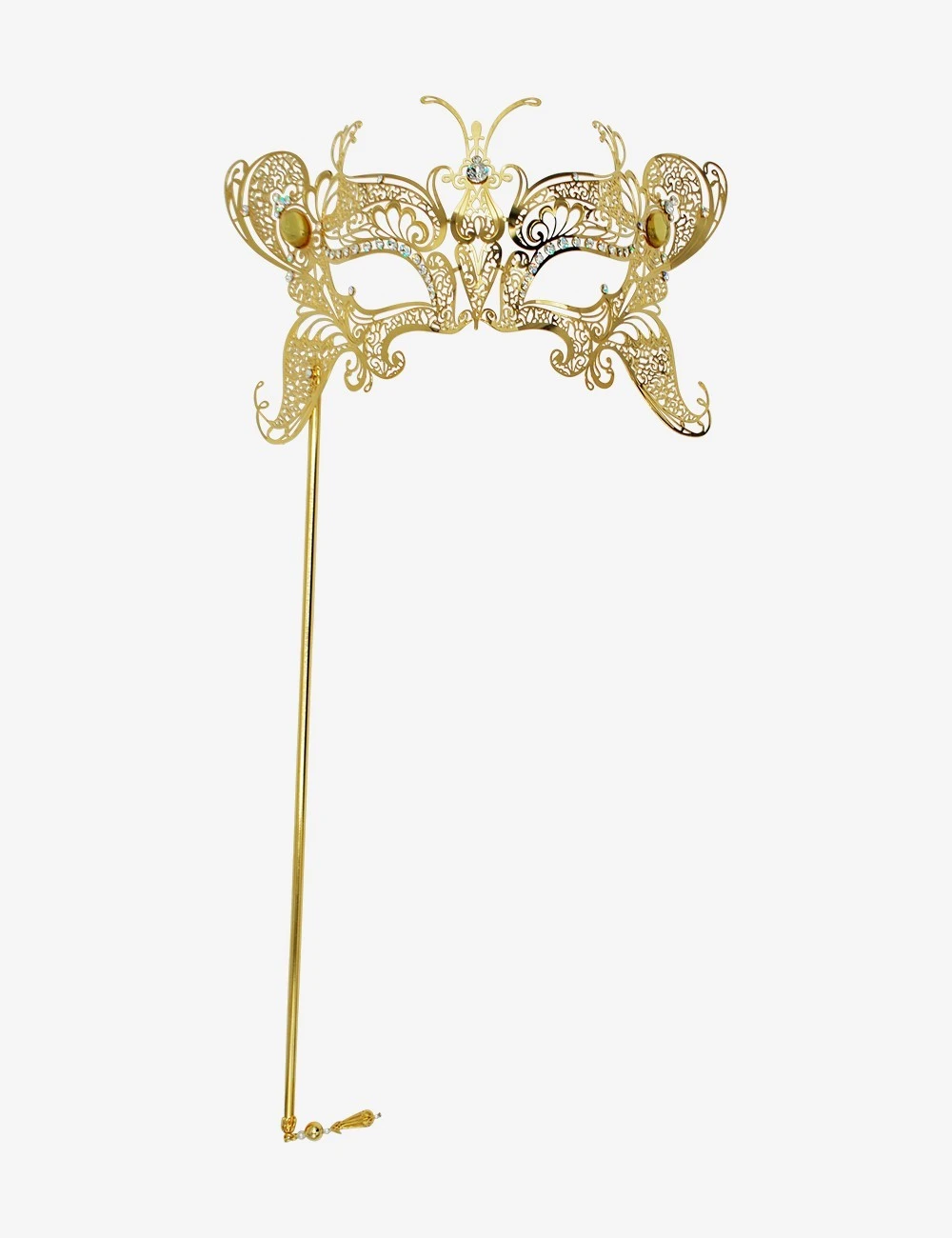 Gold Suzanne with Strass and Stick authentic venetian mask made of metal. Handcrafted according to the original Venice carnival tradition. Manufactured in Venice by the famous venetian masters. Each item is provided with certificate of authenticity.