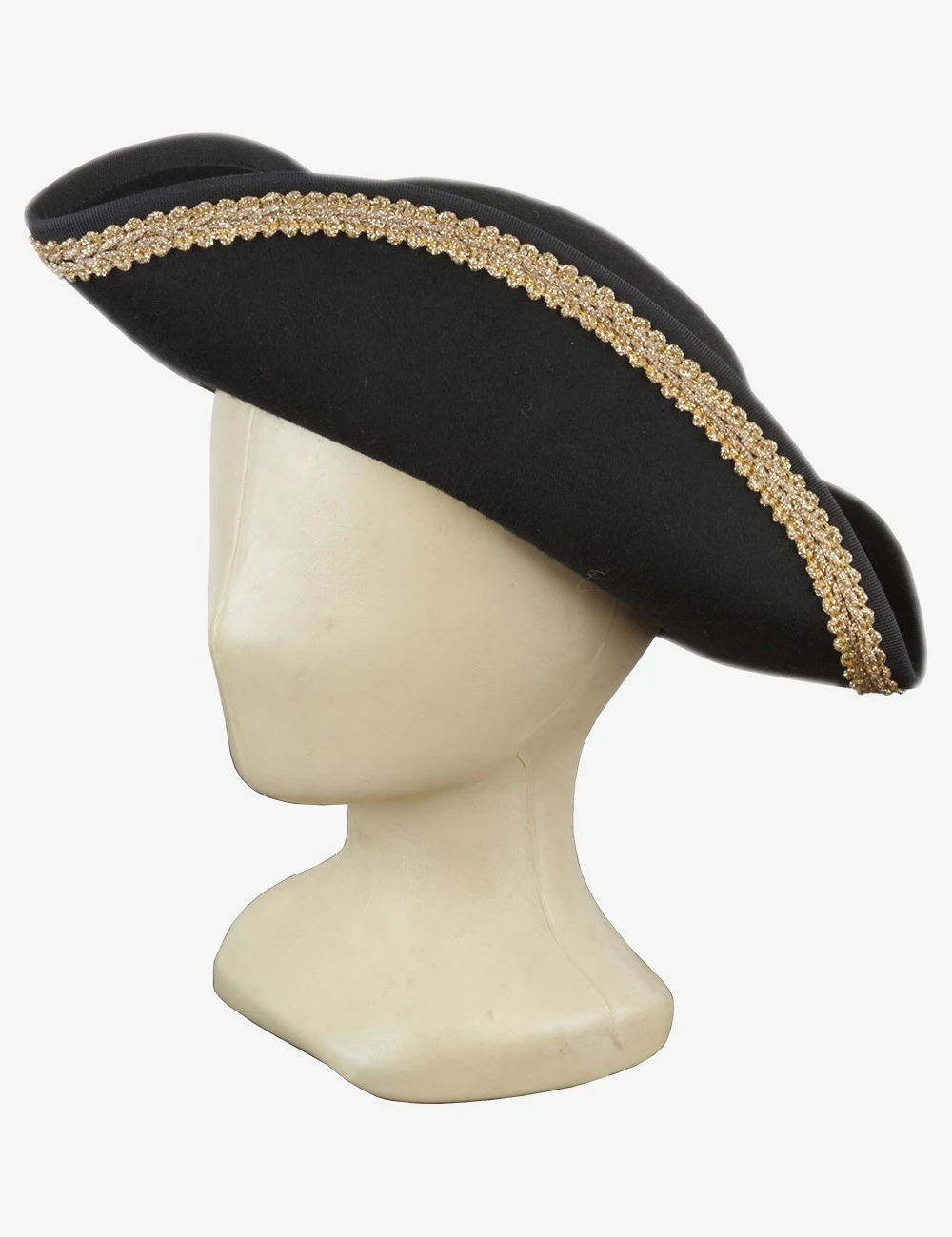 Tricorne Hat with a Coloured Edge 100% made of Wool Felt decorated with gold trimming.