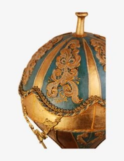 The papier-mâché base is decorated with gold leaf, trimmings, metal filigree and gold-plated chains.