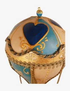 The papier-mâché base is decorated with gold leaf, trimmings, metal filigree and gold-plated chains.