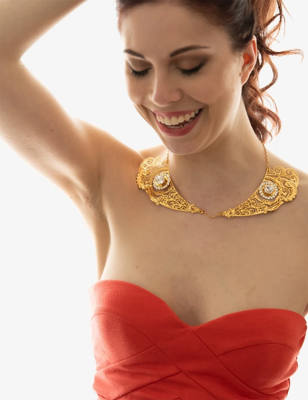 Incantata: Jewel with metal filigree body chains in bath gold embellished with high quality certified crystals. These products do not contain nickel. Handmade in our Venetian workshops.