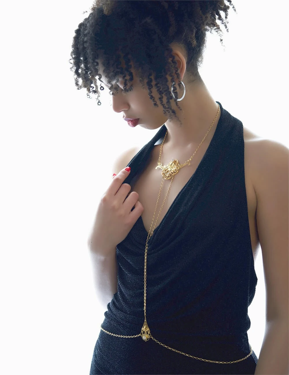 Libra: Jewel with metal filigree body chains in bath gold embellished with high quality certified crystals. These products do not contain nickel. Handmade in our Venetian workshops.