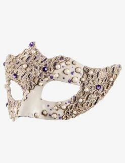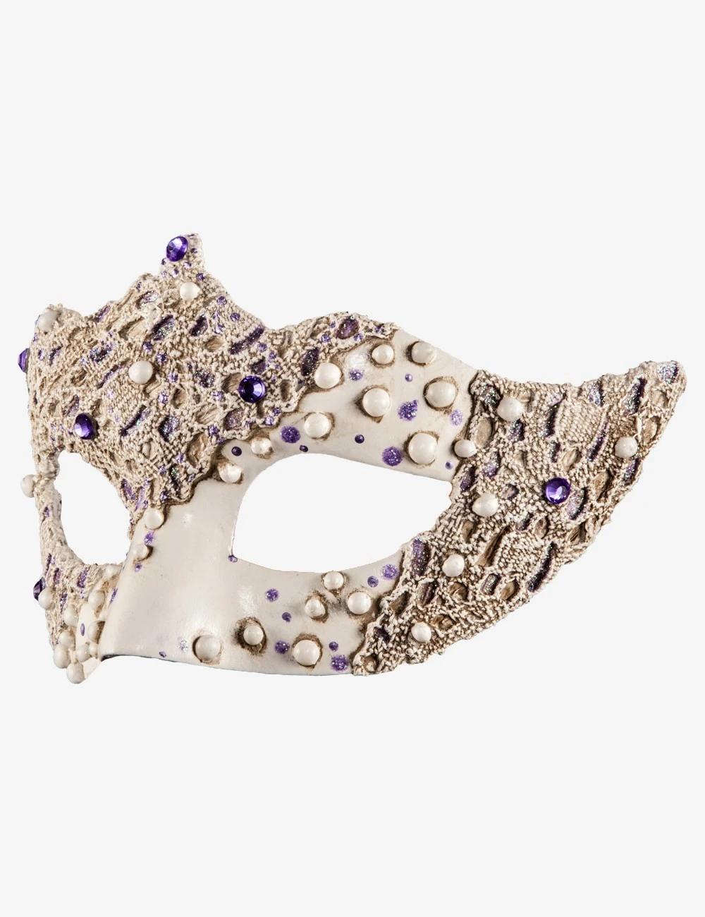 Linda venetian mask in papier mache with macramé lace decorations made in Italy. Handcrafted according to the original Venice carnival tradition.