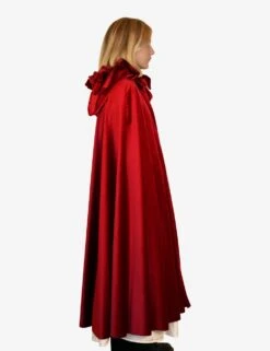 Women’s polyester velvet cape with gathered hood and velvet ribbon closure.