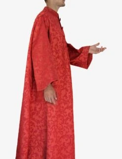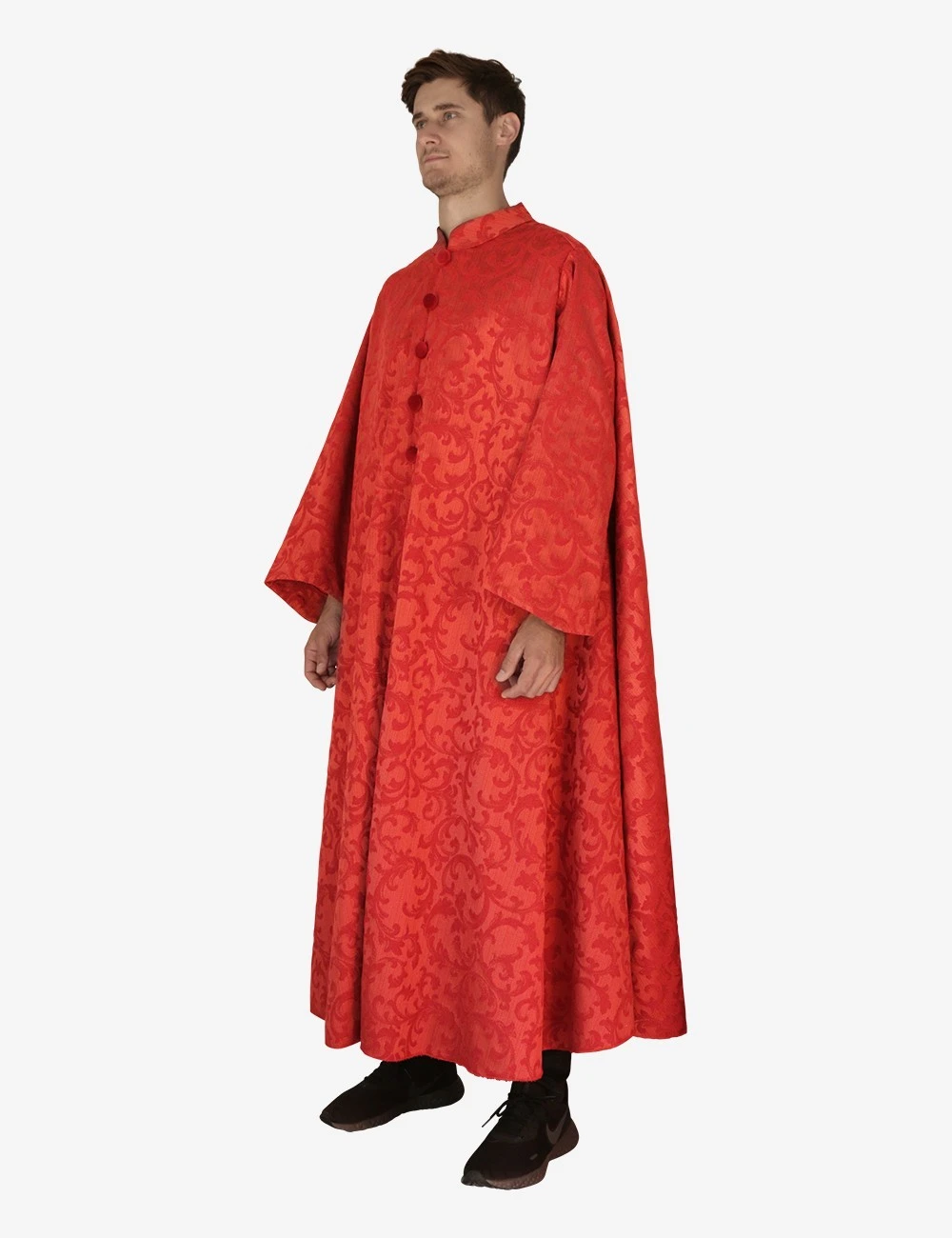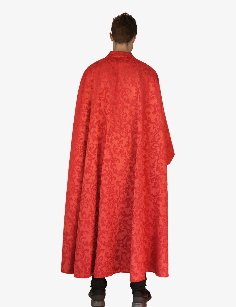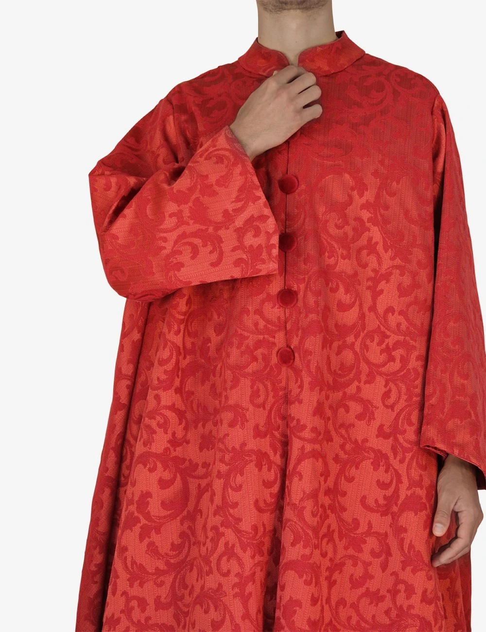 Cloak in red damask fabric with covered sleeves and buttons and mandarin collar.
