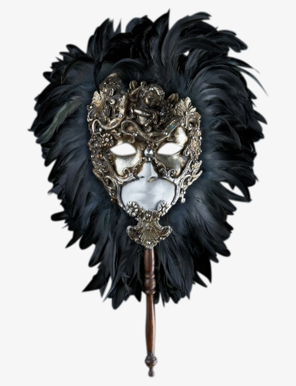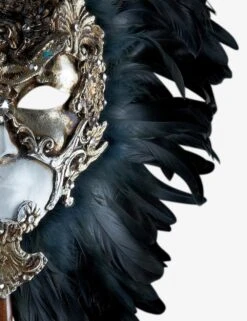 Nazca with Tabby Feathers & Stick (Bronze Base): authentic venetian mask in paper mache with a unique baroque style. This item is strictly handcrafted in Venice, Italy by the famous artists of the city according to the carnival tradition. Each item comes with certificate of authenticity.