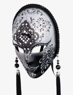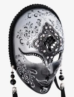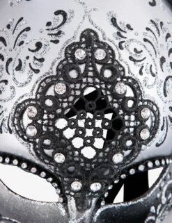 Penelope Silver and BlackĀ authentic venetian mask in papier mache with metal decoration. Handcrafted according to the original Venice carnival tradition. Manufactured in Venice by the famous venetian masters. Each item is provided with certificate of authenticity.