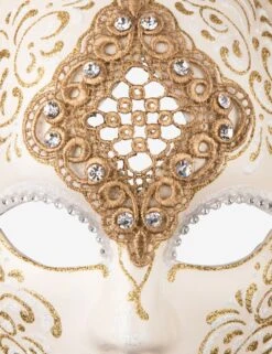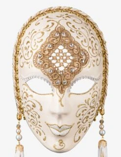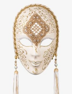 Penelope White GoldĀ authentic venetian mask in papier mache with metal decoration. Handcrafted according to the original Venice carnival tradition. Manufactured in Venice by the famous venetian masters. Each item is provided with certificate of authenticity.