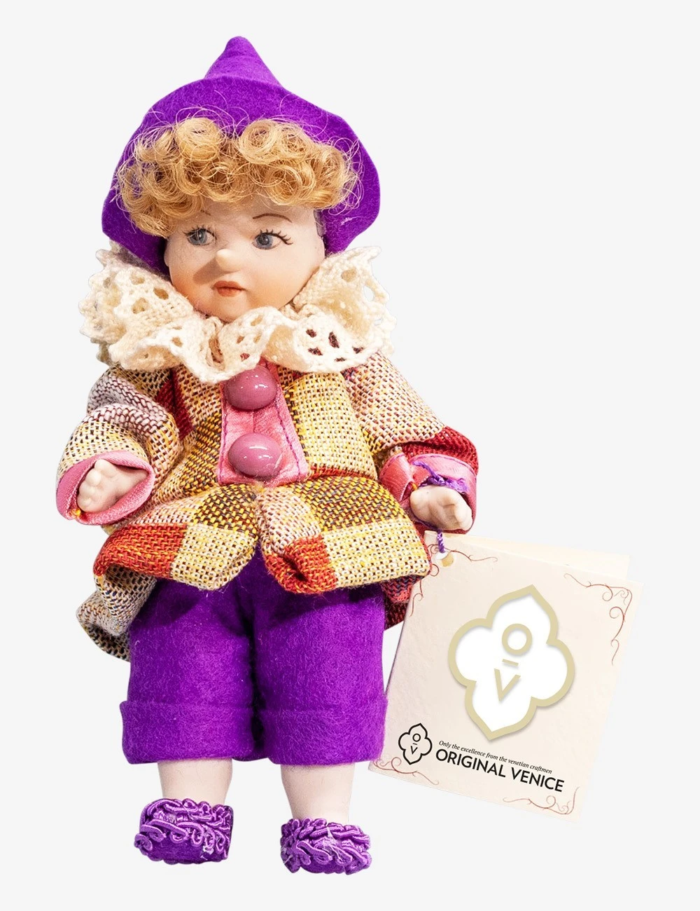 Pinocchio 004:Ā Genuine Venetian Doll of baked porcelain, hand-painted and decorated. Fabrics, cloths and trimmings are tailor-made in our Venetian workshops. Arms and legs are movable, so as to allow you to place the item in the desired posture (standing, sittingā¦).