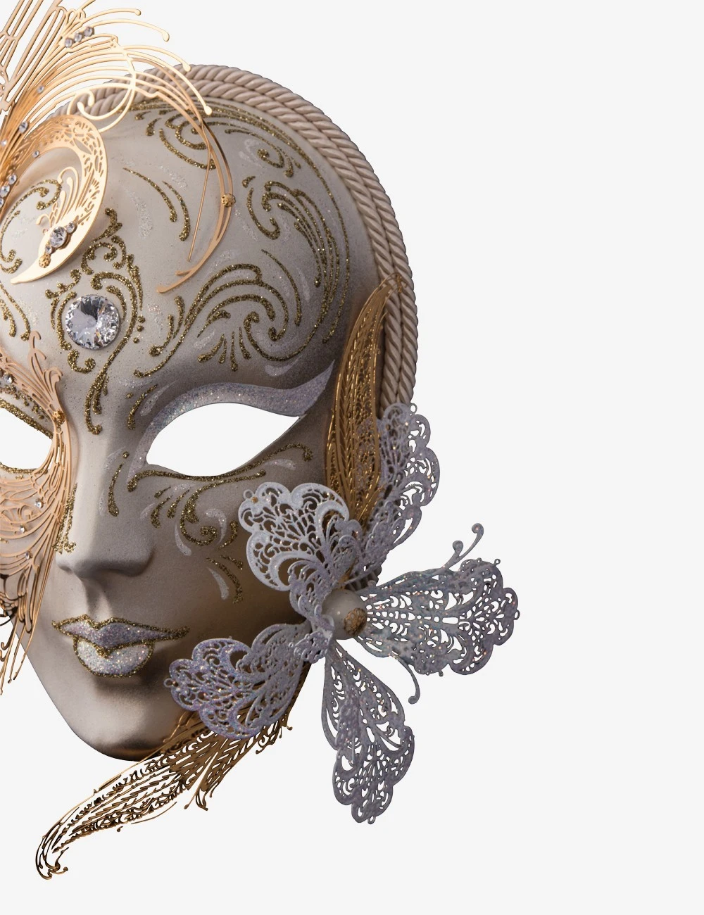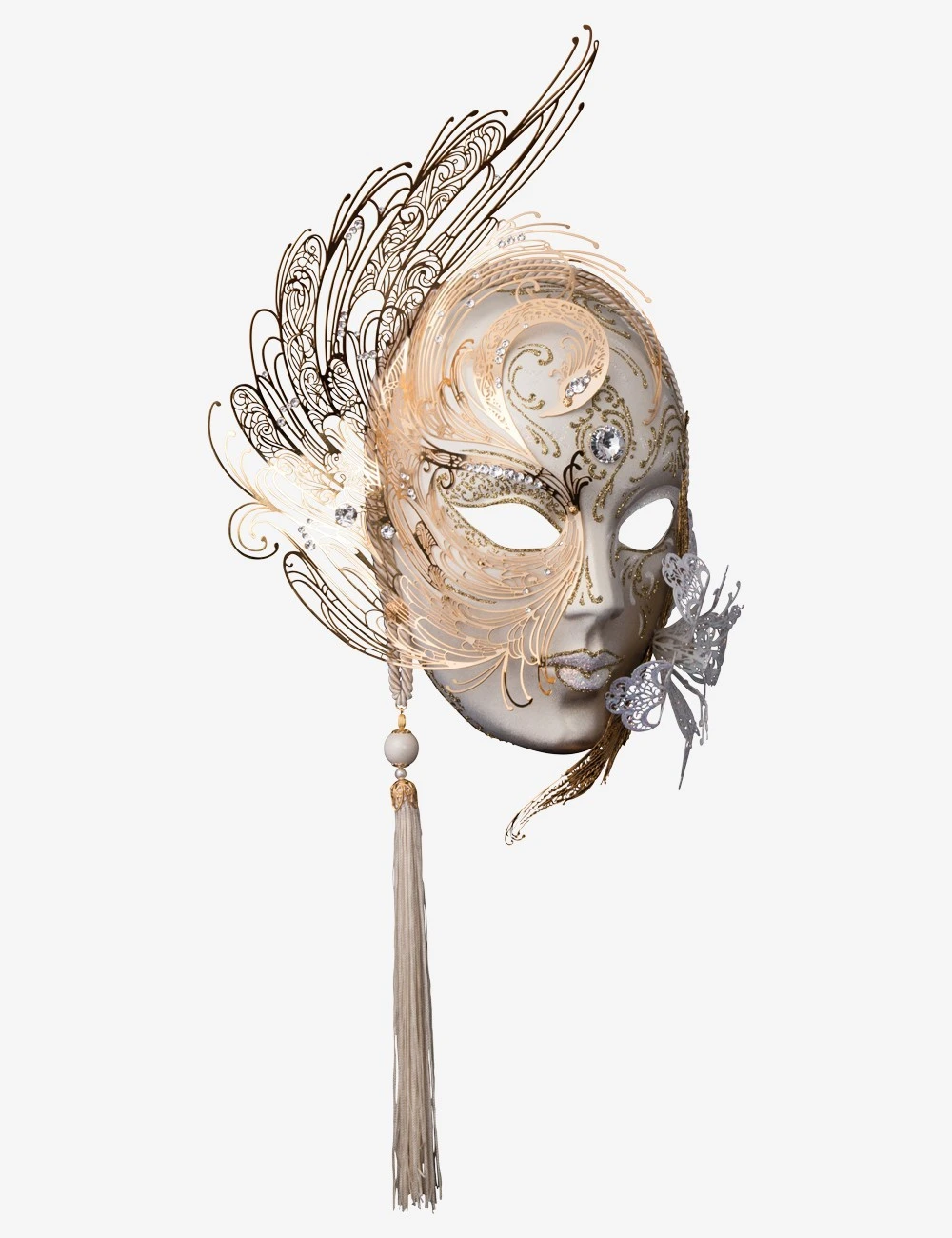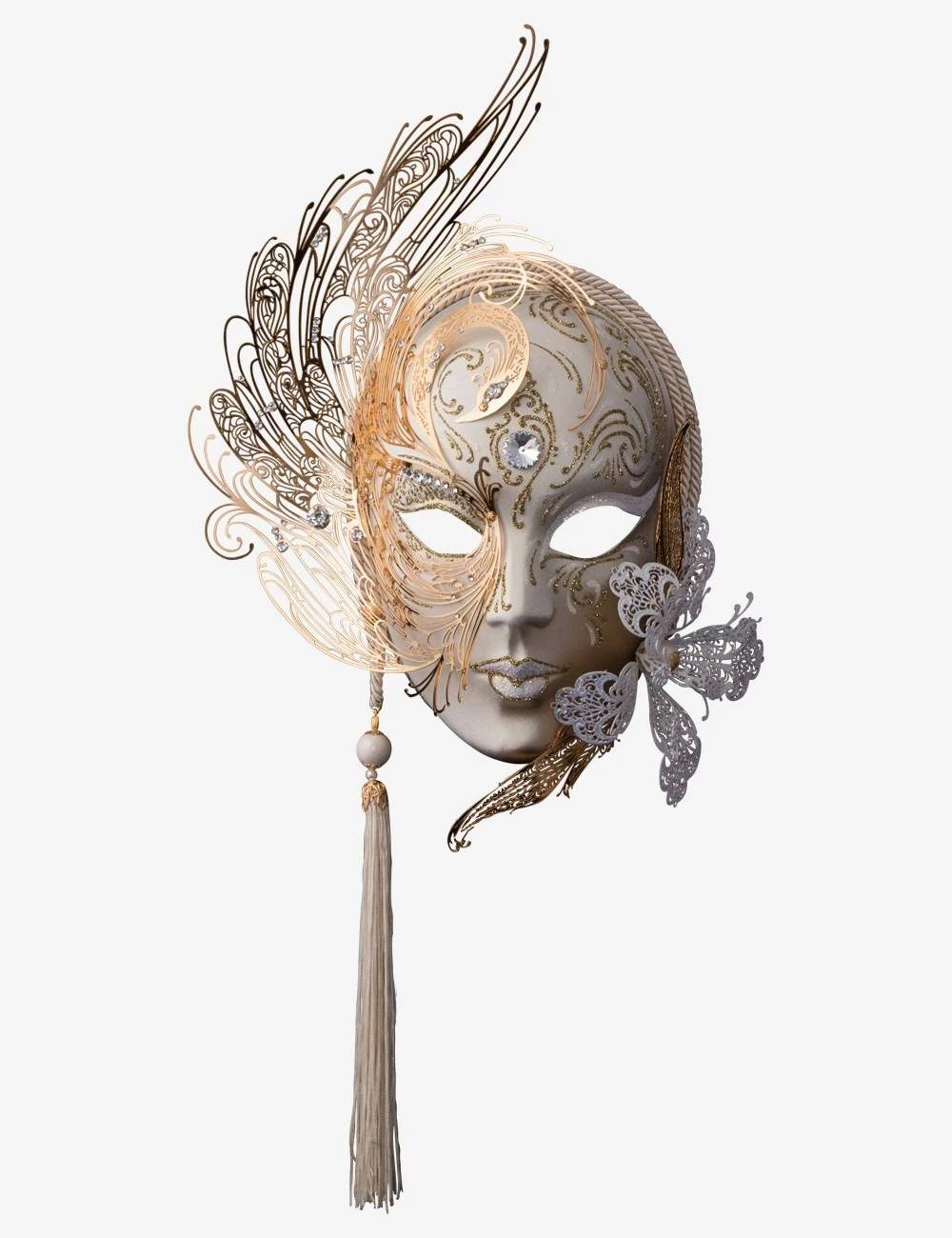 Placida authentic venetian mask in papier mache with metal decoration. Handcrafted according to the original Venice carnival tradition. Manufactured in Venice by the famous venetian masters. Each item is provided with certificate of authenticity.