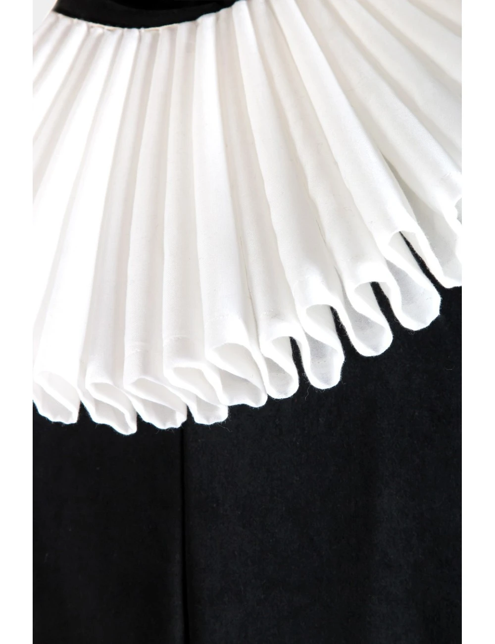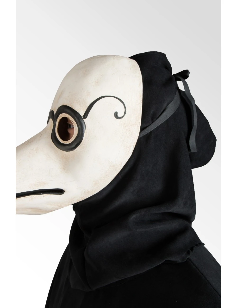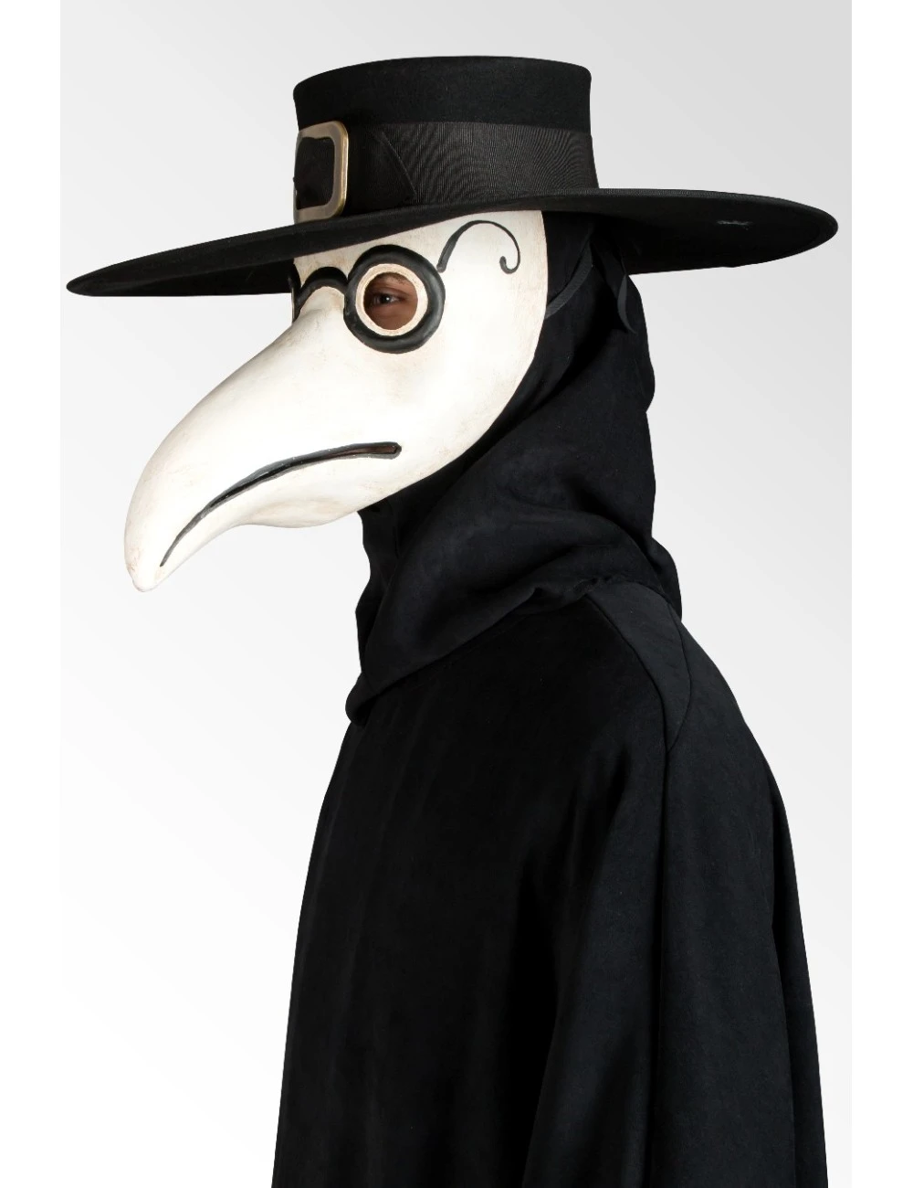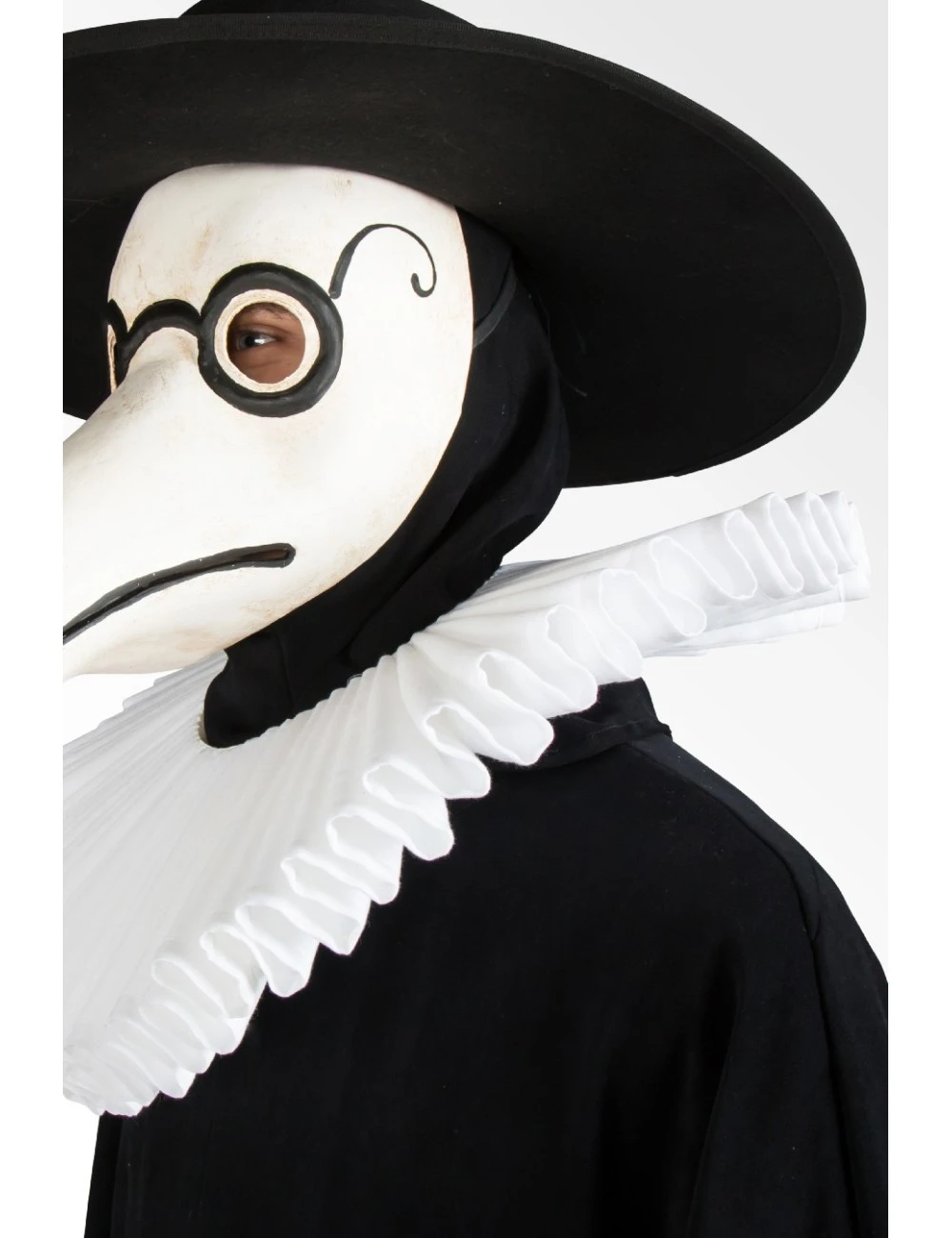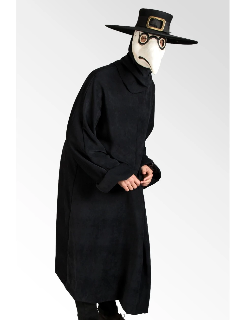 An authentic reproduction of the historic Black Plague Doctor costume, made up of a black Polyester and Viscose tunic, Black Plague Doctor hat, Ruff and Black Plague Doctor mask.