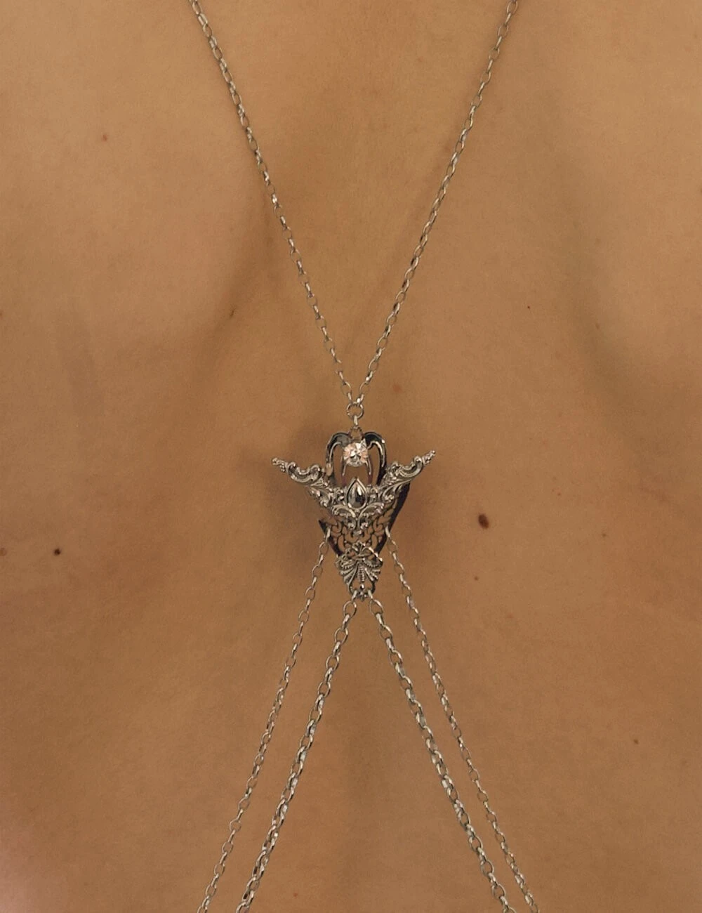 Portafortuna: Jewel with metal filigree body chains in bath silver embellished with high quality certified crystals. These products do not contain nickel. Handmade in our Venetian workshops.