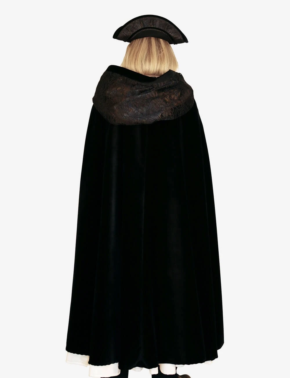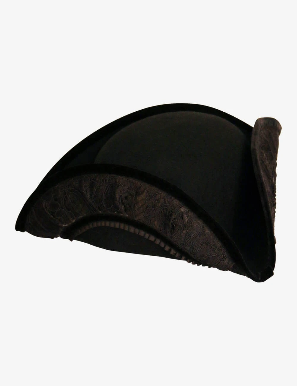 Genuine tricorn made of black wool felt, bordered with velvet and embellished with macramé lace