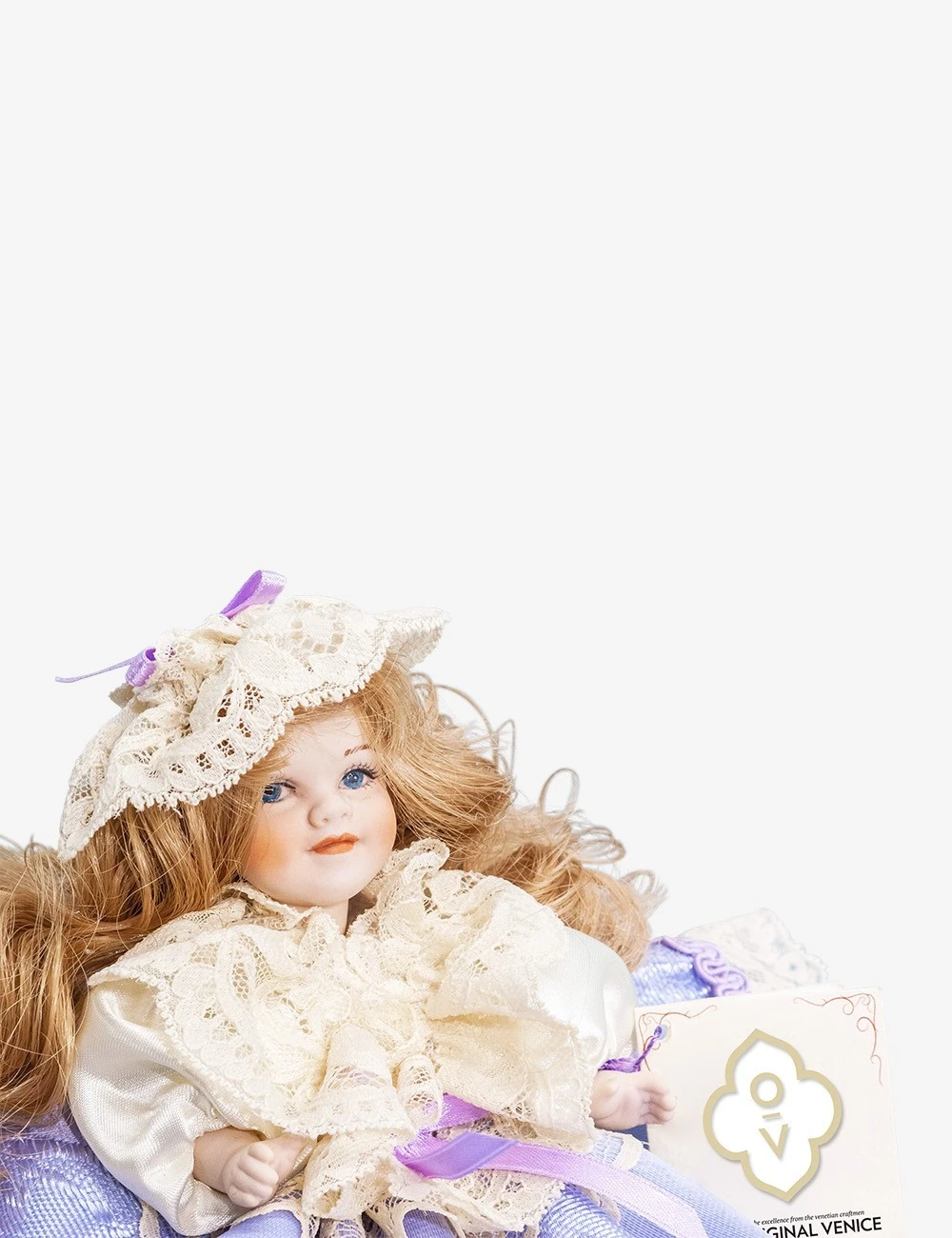Purple Sissy:Ā Genuine Venetian Doll of baked porcelain, hand-painted and decorated. Fabrics, cloths and trimmings are tailor-made in our Venetian workshops. Arms and legs are movable, so as to allow you to place the item in the desired posture (standing, sittingā¦).