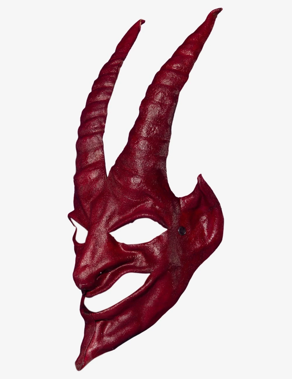 Red Devil leather mask with laces to be worn, handcrafted in our Workshops in Italy. Made and decorated by hand, it maintains an elasticity that guarantees excellent long-lasting wearability suitable for performances such as theatre, acting, dance, etc.