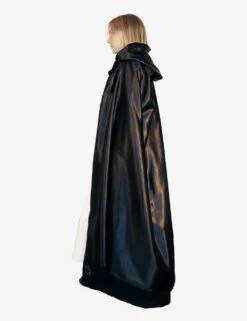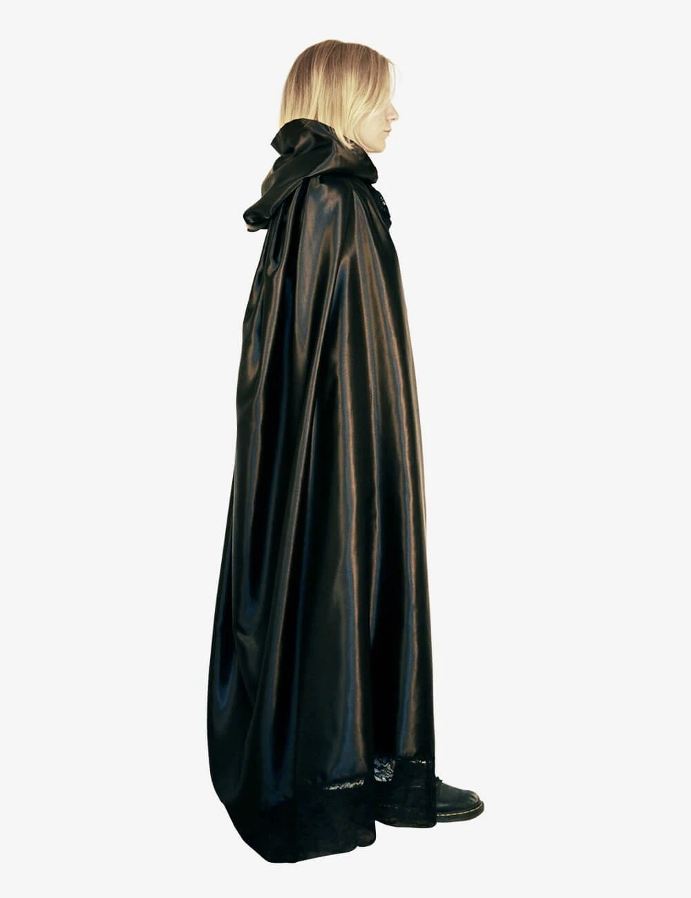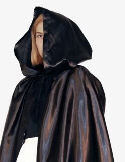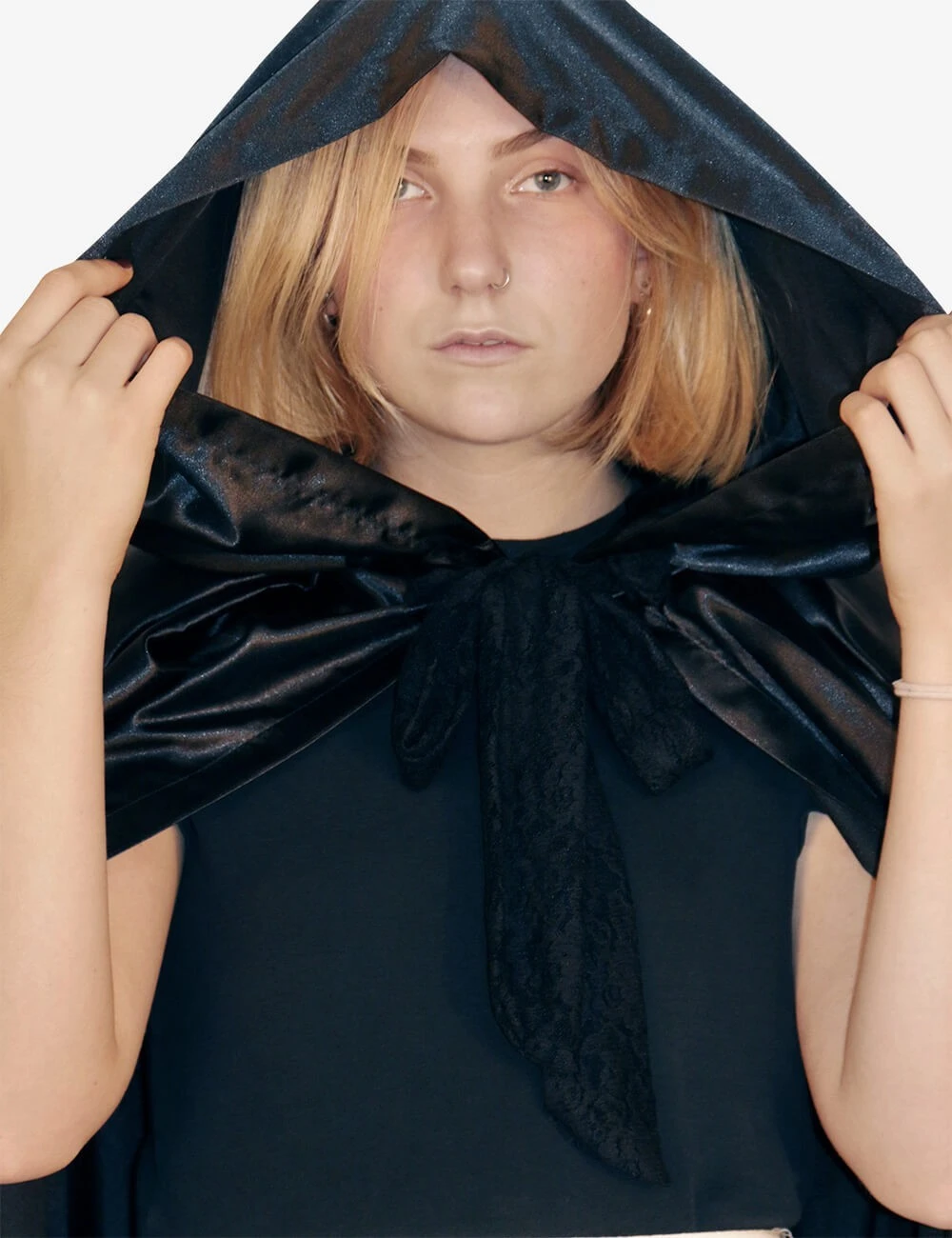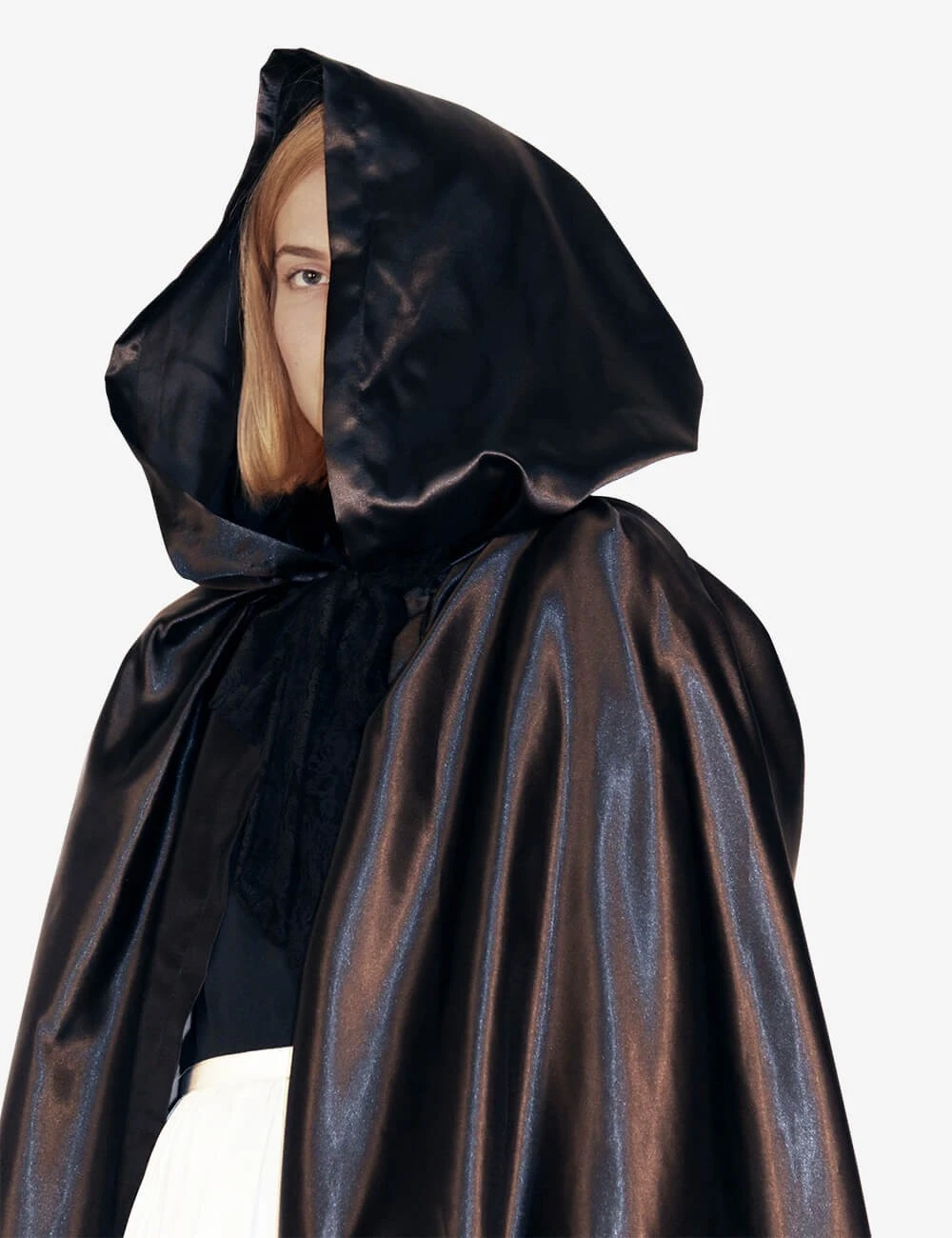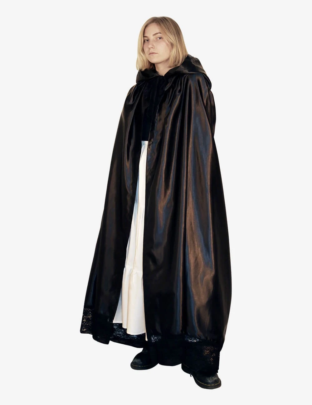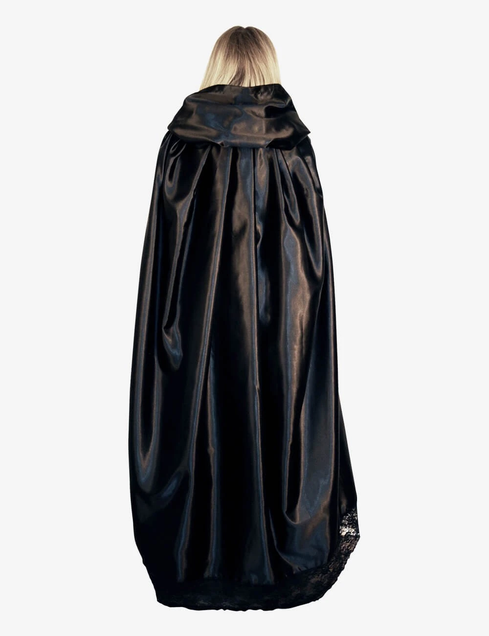 Black Varese satin cape with hood embellished with lace ribbon closure and lace border at the bottom