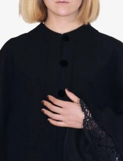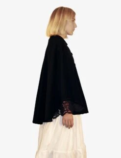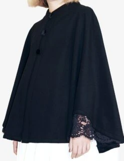 Wool cape with round neck Shaped on the sleeves and embellished with macramé lace at the hands. Three-button closure covered with velvet