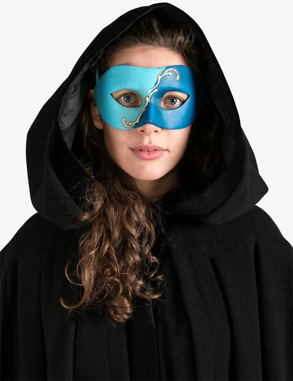 Pure wool hooded cloak, fastening with velvet ribbons and velvet hemmed hood.