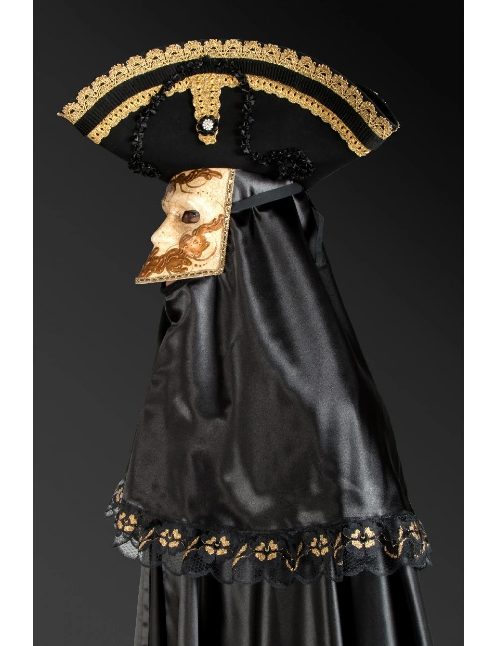 Zendal style hood 3 in Varese Satin and Light Lace with black/gold flower trim, this is a typical Venetian accessory used to complete the “Bauta” costume.